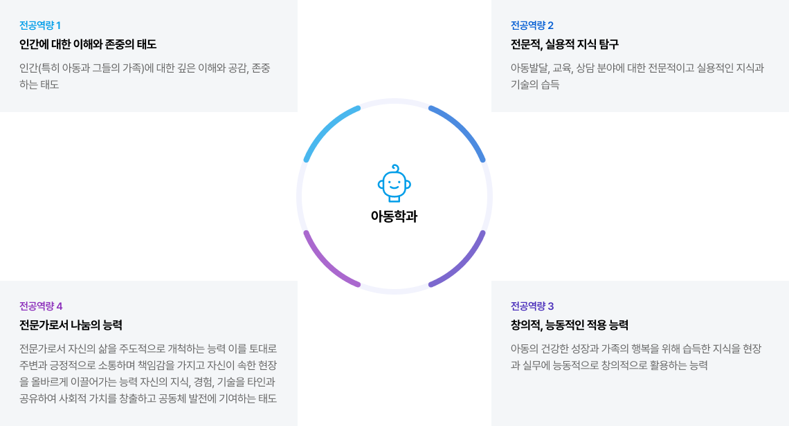 | 3. 창의적, 능동적인 적용 능력 | 아동의 건강한 성장과 가족의 행복을 위해 습득한 지식을 현장과 실무에 능동적으로 창의적으로 활용하는 능력 |