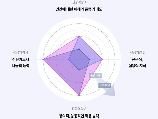 전공역량 전공교육목표 | 인간에 대한 이해와 존중의 태도 | 전문적, 실용적 지식 탐구 | 창의적, 능동적인 적용 능력 | 전문가로서 나눔의 능력 |