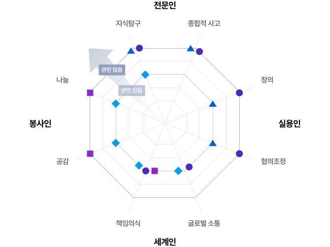 | 4. 전문가로서 나눔의 능력 | 전문가로서 자신의 삶을 주도적으로 개척하는 능력 이를 토대로 주변과 긍정적으로 소통하며 책임감을 가지고 자신이 속한 현장을 올바르게 이끌어가는 능력 자신의 지식, 경험, 기술을 타인과 공유하여 사회적 가치를 창출하고 공동체 발전에 기여하는 태도 |