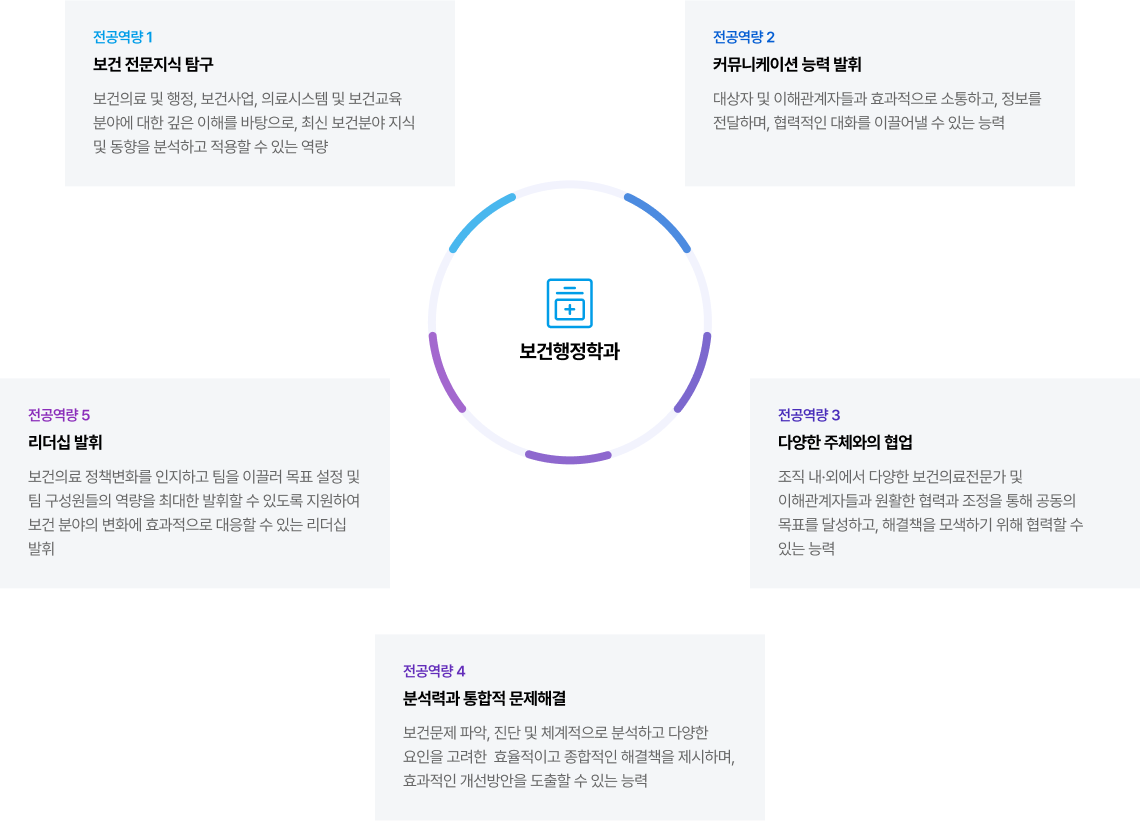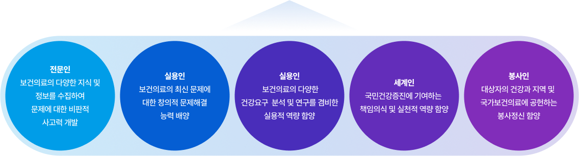 전공역량 전공교육목표 | 보건 전문지식 탐구 | 커뮤니케이션 능력 발휘 | 다양한 주체와의 협업 | 분석력과 통합적 문제해결 | 리더십 발휘 |