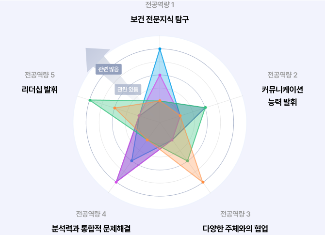 전공역량 학교역량 | 보건 전문지식 탐구 | 커뮤니케이션 능력 발휘 | 다양한 주체와의 협업 | 분석력과 통합적 문제해결 | 리더십 발휘 | |