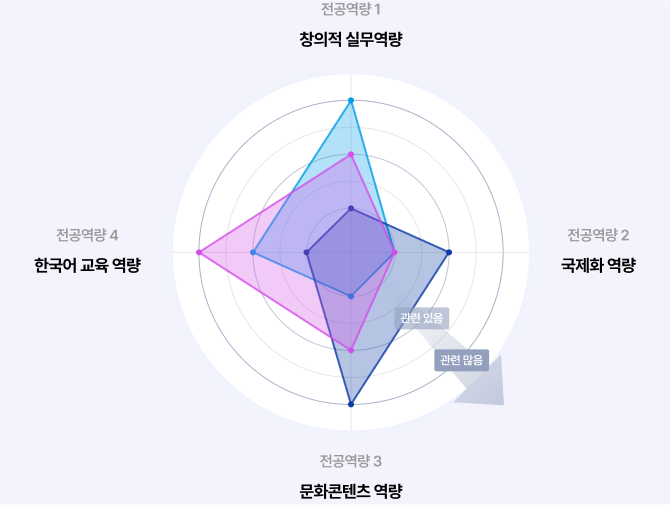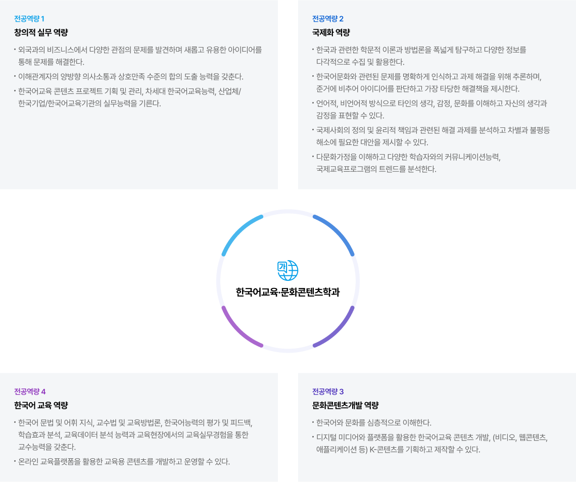 전공역량 전공교육목표 | 창의적 실무역량 | 국제화역량 | 문화콘텐츠역량 | 한국어교육역량 |