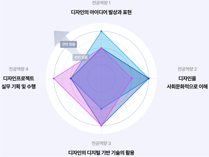 전공역량 학교역량 | 디자인의 아이디어 발상과 표현 | 디자인을 사회문화적으로 이해 | 디자인의 디지털 기반 기술의 활용 | 디자인프로젝트 실무 기획 및 수행 | |